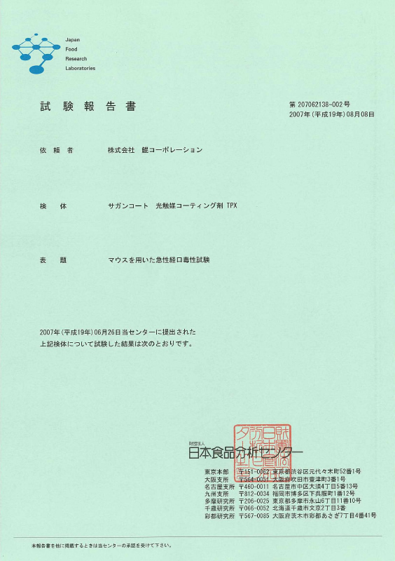 当社の光触媒コーティング剤(サガンコート)は、厳しい試験をクリアしたものを使用しています。